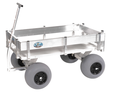 The BIG KAHUNA has reinforced and raised undercarriages 2″ taller than our standard pull wagon to accommodate the four 11.8″ x 7″ balloon beach/sand tires.