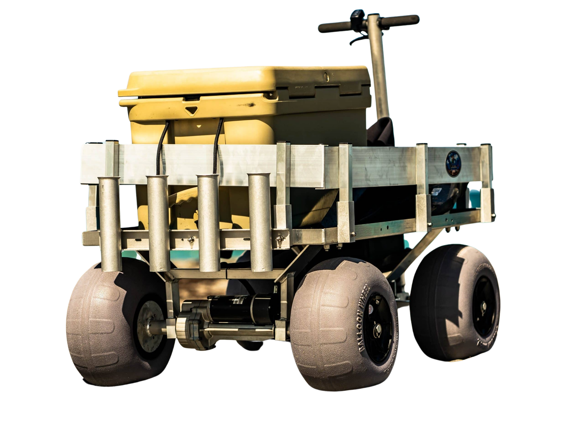 The World’s Finest beach and fishing wagon has now gone ELECTRIC! “Pulling” your wagon across the beach is no longer necessary. Just grab the handle, press the throttle and STEER your wagon to your destination with no effort whatsoever.