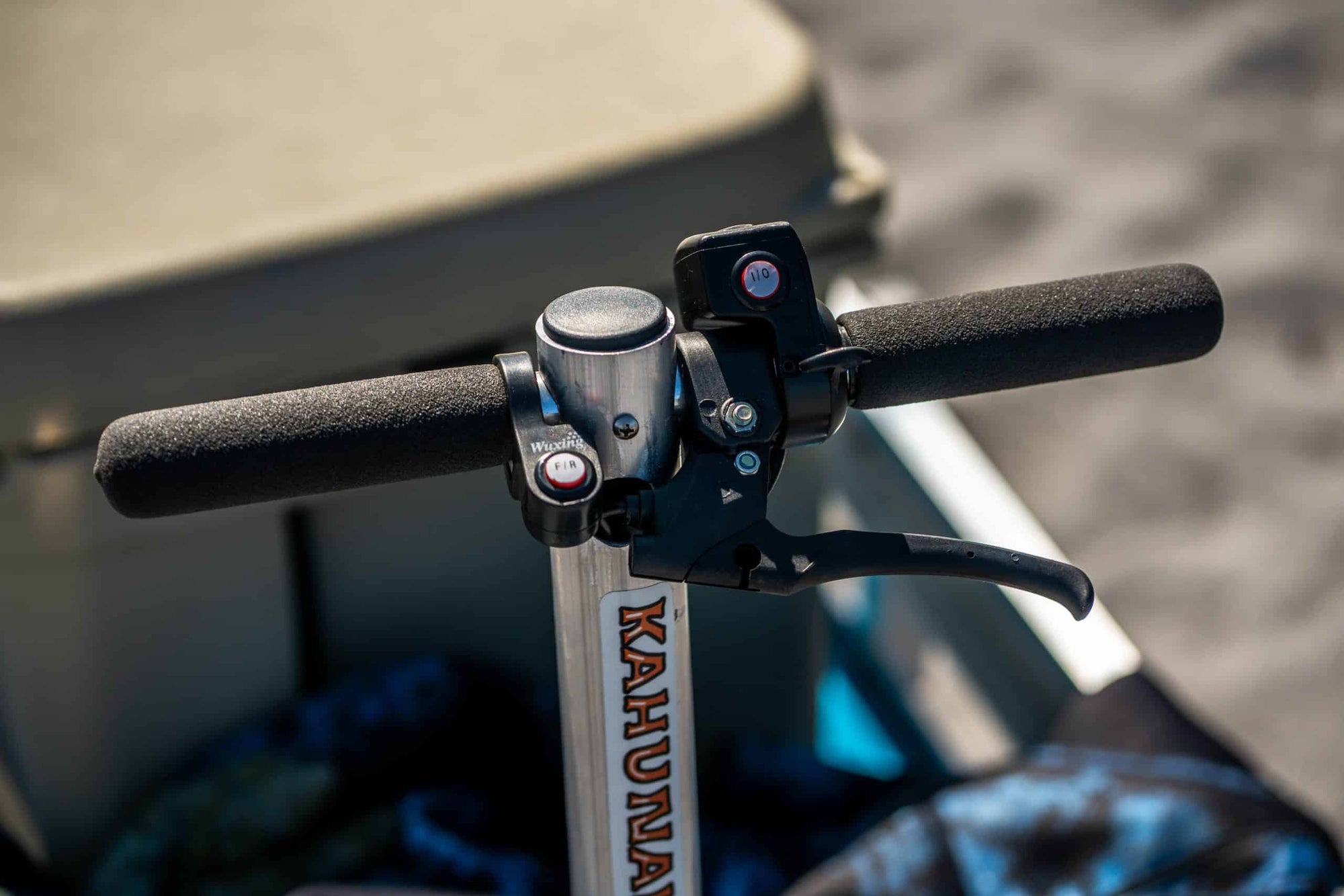 Pull handle features a “dead man” safety lever in conjunction with speed throttle. Both components must be used simultaneously to engage the electric assist.