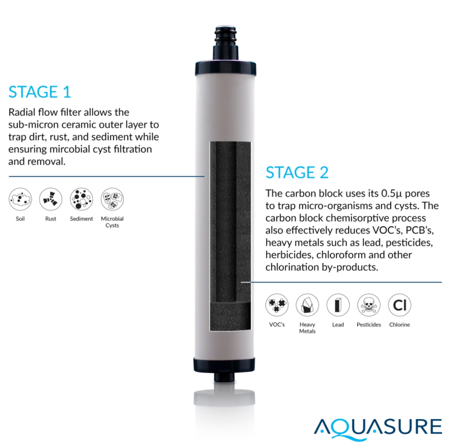 Equipped with Multi-stage 0.5 Micron Micro-Ceramic Carbon Block with Microban technology that reduces 100s of water contaminants such as Volatile Organic Compounds (VOC's), PCB, Pesticides, Herbicides, Chloroform and other chlorination by-products.