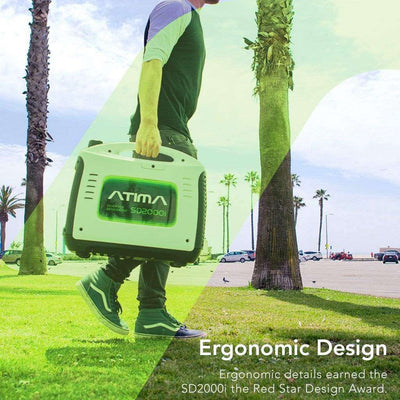 - ERGONOMIC AND ACCESSIBLE DESIGN - Atima believes industrial design should be thoughtful, and the dual-use features earned SD2000i the Red Star Design Award. In addition, the SD2000i kit is simple to use. Once running, virtually anyone who can use a standard electrical outlet will be able to enjoy your generator, lasting much longer than battery-powered or propane generators.