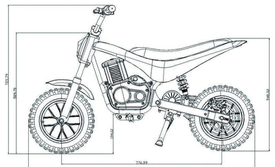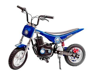 Every Inch of this bike says motorcycle! We have created the coolest and best quality piece out there. We've scaled down a cross between a TT Enduro and a Flat Tracker to give you a distinct look, added large diameter aluminum alloy wheels with 12.5" diameter pneumatic tires, rear disc brakes and a taller and wider 21" seat height for rider comfort with adjustable wide handle bars for added control. Heavy duty welded steel tube frame with adjustable mono shock rear suspension and telescopic front forks make this bike a very smooth ride. A realistic looking engine houses the power source and really helps set this bike apart from the competition. Our 250W motor with a 24V SLA deep cycle battery power system includes a charge indicator mounted on the motorcycle style twist grip throttle control.