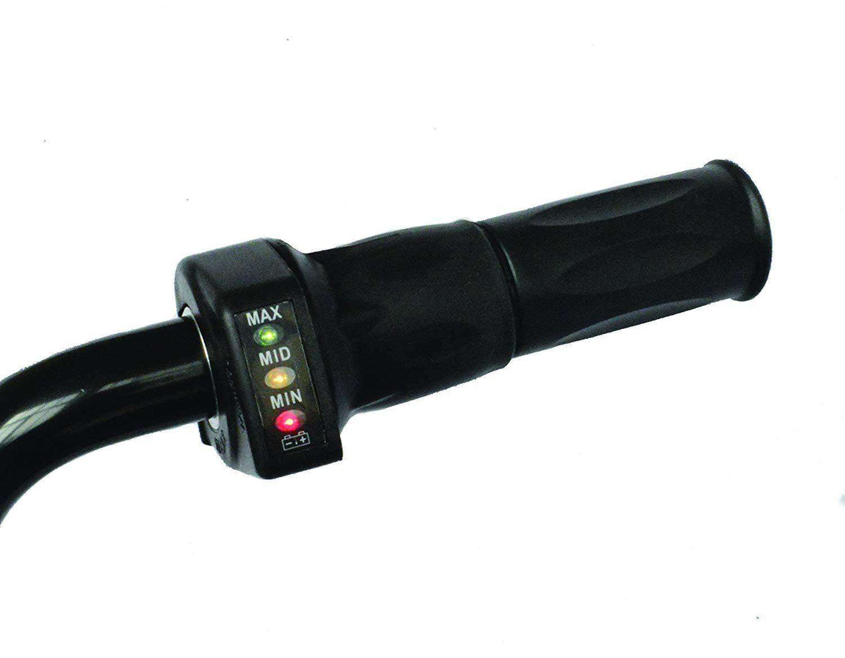 Every Inch of this bike says motorcycle! We have created the coolest and best quality piece out there. We've scaled down a cross between a TT Enduro and a Flat Tracker to give you a distinct look, added large diameter aluminum alloy wheels with 12.5" diameter pneumatic tires, rear disc brakes and a taller and wider 21" seat height for rider comfort with adjustable wide handle bars for added control. Heavy duty welded steel tube frame with adjustable mono shock rear suspension and telescopic front forks make this bike a very smooth ride. A realistic looking engine houses the power source and really helps set this bike apart from the competition. Our 250W motor with a 24V SLA deep cycle battery power system includes a charge indicator mounted on the motorcycle style twist grip throttle control.
