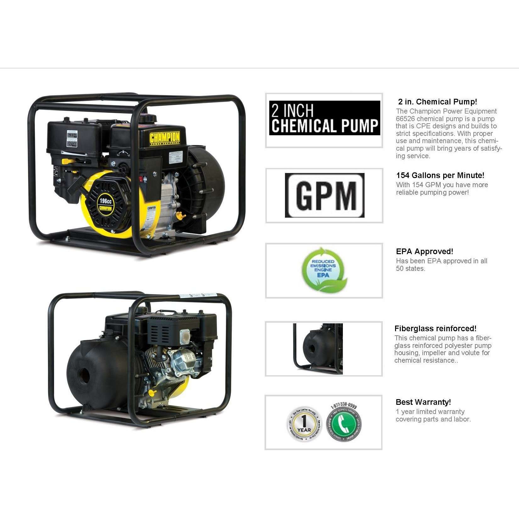 Champion’s 2-inch Chemical Water Transfer Pump is designed for fast, efficient pumping. This unit will pump 154 gallons of water a minute and is powered by a 196cc Champion engine. With included clear water fittings and constructed of chemical resistant materials, this unit is your perfect pumping solution.