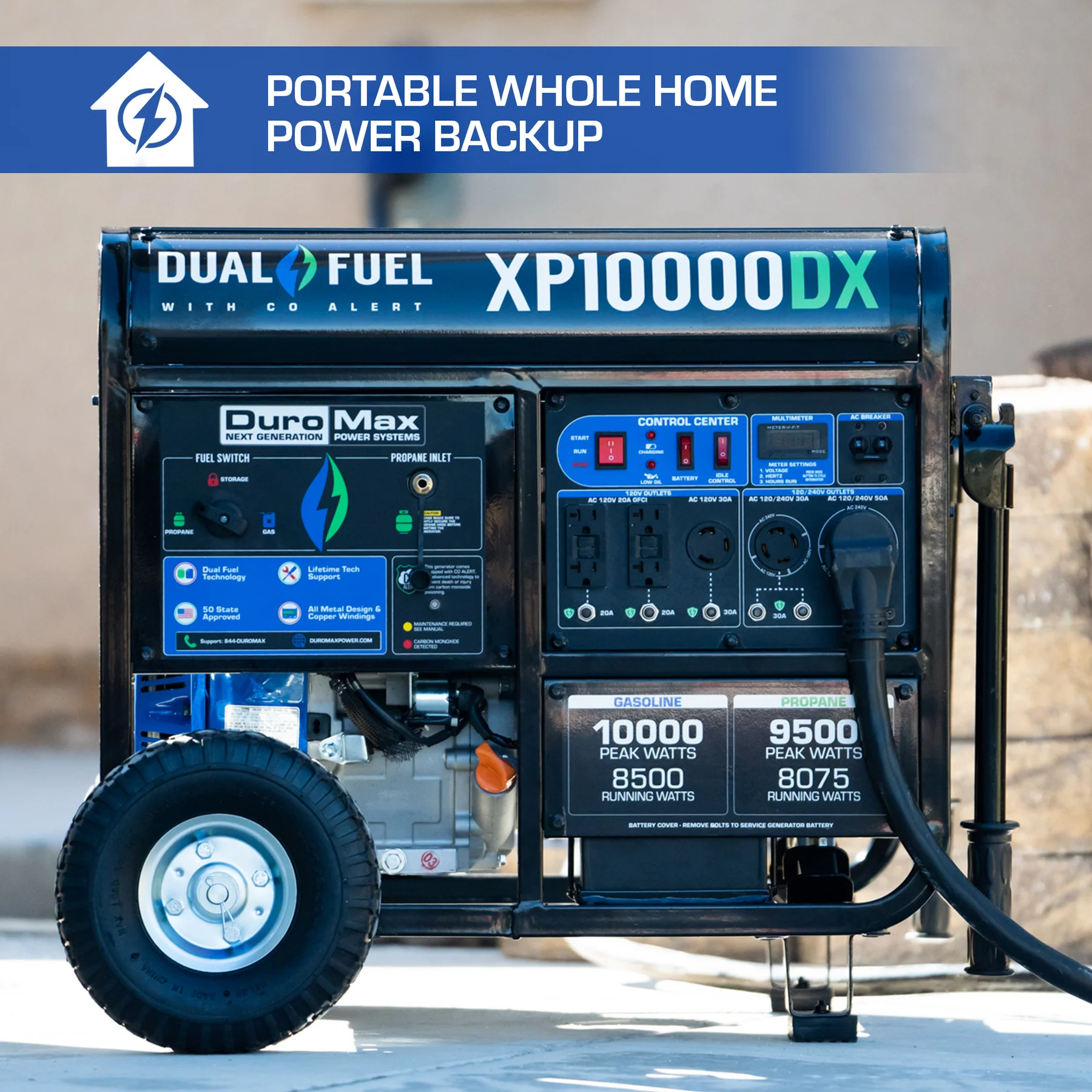 The XP10000DX is the most VERSATILE Dual Fuel generator of our new lineup, with 10,000 peak watts and 8,500 running watts. Powered by our DuroMax 420cc OHV engine, this generator is PERFECT for HOME POWER BACKUP and will run your household essentials such as lights, appliances, and central AC system with EASE during a blackout, storm, or emergency event.
