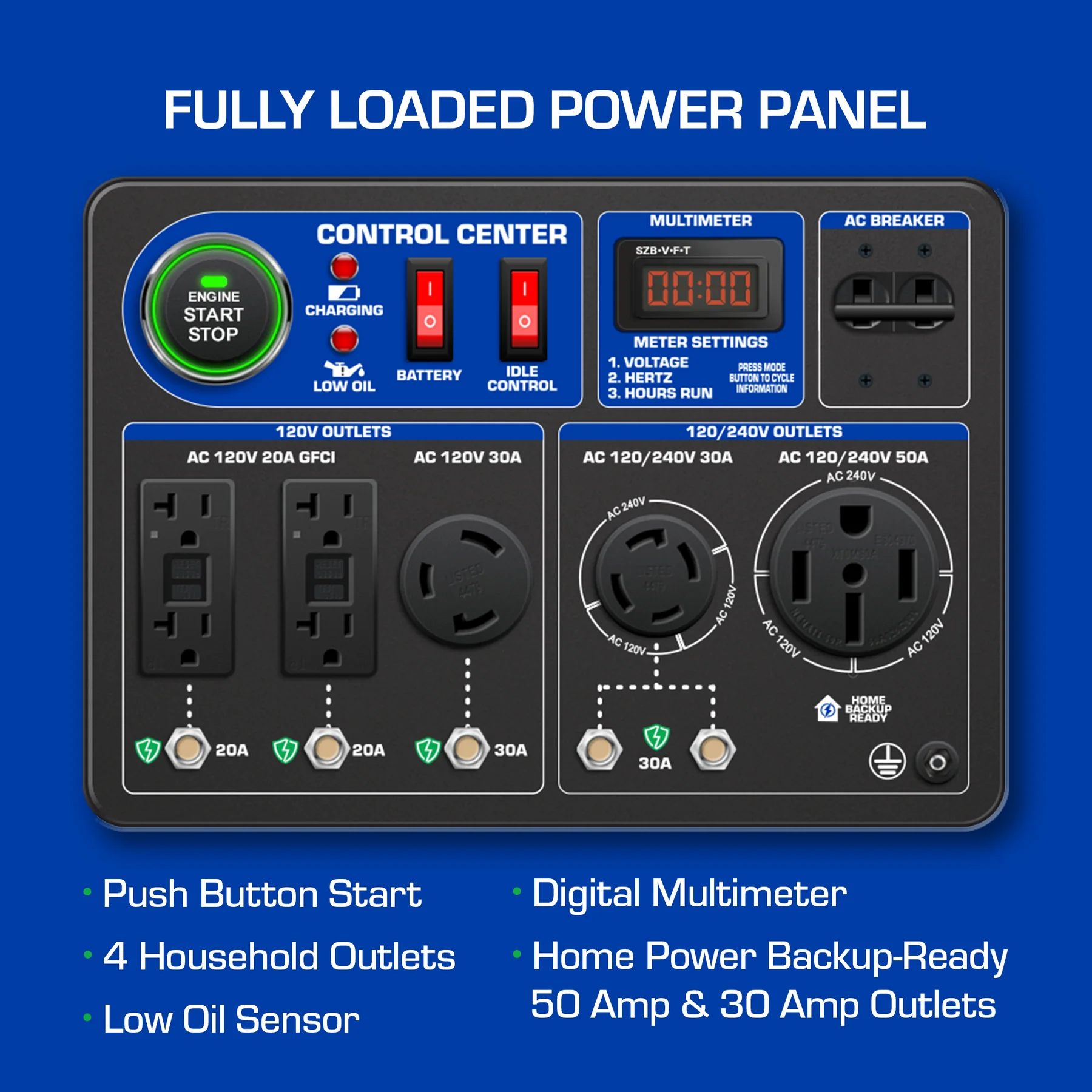 - Power Panel: a push button start, a digital multimeter, and a variety of outlets including a transfer switch-ready 50 Amp outlet
