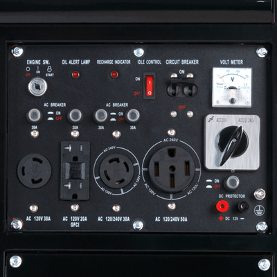 - Fully Featured Power Panel – The power panel includes a wide selection of outlets for maximum compatibility in your applications including: (2) 120V household GFCI outlets, (1) 120V 30A twist lock outlet, (1) 240V 30A outlet, and (1) 240V 50A outlet. The panel also includes a voltmeter and 12V DC charging posts for charging external batteries.