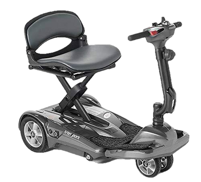 The EV Rider Transport AF+ scooter automatically folds up with your handheld remote. With the push of a button, it automatically folds in seconds! Approved for airline travel, the S19AF is equipped with an 11.5Ah lithium battery and weighs just 49 lbs making it perfect for travel on planes, trains, and cruise ships. Due to its ultra-tight turning radius, this compact scooter offers great maneuverability in narrow spaces. It features a height-adjustable tiller, LED headlight, and dual hand two-way throttle control. It can be stored virtually anywhere and easily fits in the trunk of most automobiles. Just press the button and watch this innovative scooter unfold!