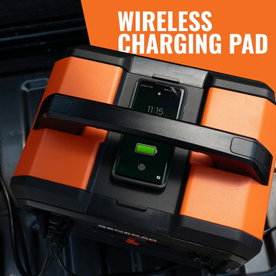 - At just 43 lbs., simply grab hold of the ergonomic handle and take your power station from place to place, keeping cords and cables neat and tidy in the onboard storage compartment.