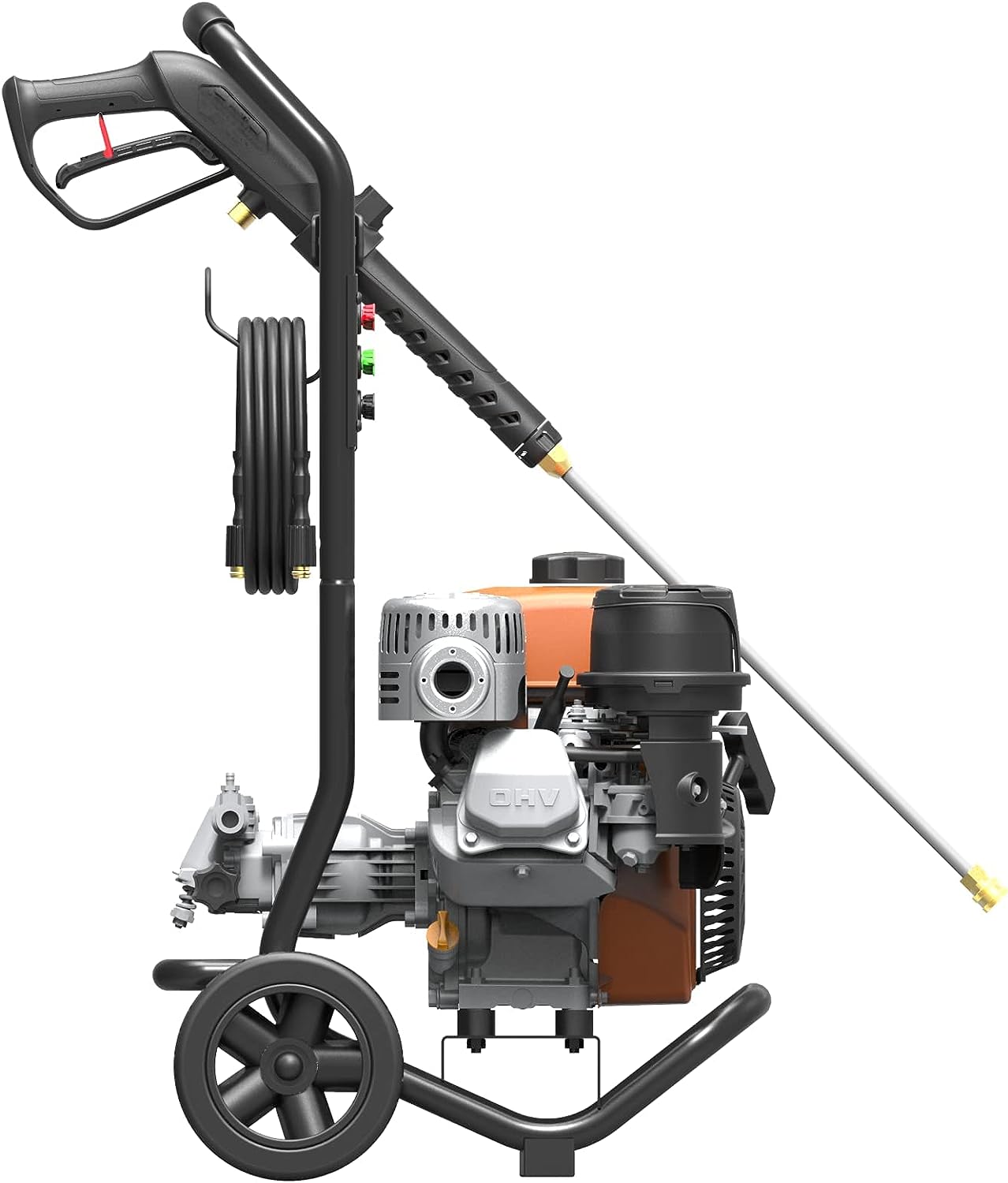 The GENMAX GPW3000-H Gasoline Pressure Washer 3000 PSI and 2.4 GPM with 212cc Engine. Fully assembled and easy-to-start includes Spray Gun and Wand, 3 Quick-Connect Nozzles, High-Pressure Hose (25ft), Best for Cleaning Homes, Cars, Driveways, and Patios.