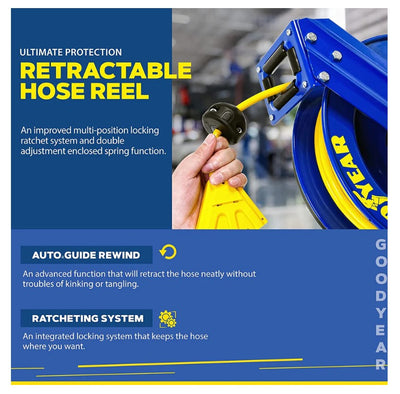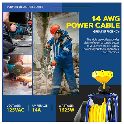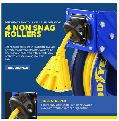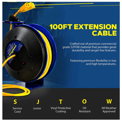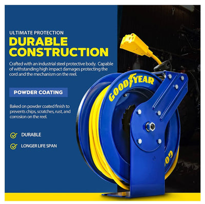 Goodyear GUR073 Retractable Extension Cord Reel Mountable 14AWG x 100' 14A Triple Connector New