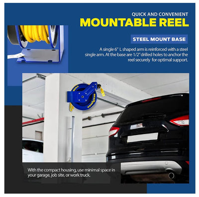 • Our Extension Cord Reel is designed to lock the cord securely at any desired length, thanks to its double adjustment improved ratcheting system. Constructed from heavy gauge commercial steel and finished with a corrosion-resistant powder coating, this reel is incredibly durable and dependable. Its spring driven auto-rewind mechanism ensures safe and easy storage of the cord.