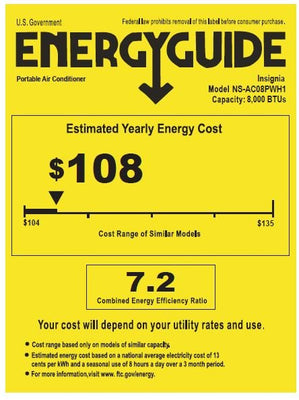 Cool up to 350 sq. ft. with this Insignia portable air conditioner. The 8000 BTU of cooling power helps keep your room at a comfortable temperature, while the three modes provide flexible functionality. This white Insignia portable air conditioner has a built-in sleep mode for energy savings, and the included remote control ensures easy operation.