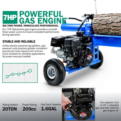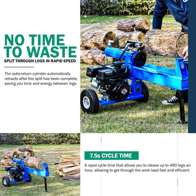 • EFFICIENT - Our 7HP Gas Engine provides a smooth linear power curve to help avoid clunky performance during operation. A constant splitting force allows the wedge to smoothly slice through your wood pile with confidence; Effortlessly complete large splitting jobs with only a 7.5-second cycle time reset in-between log splits.