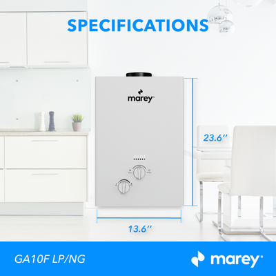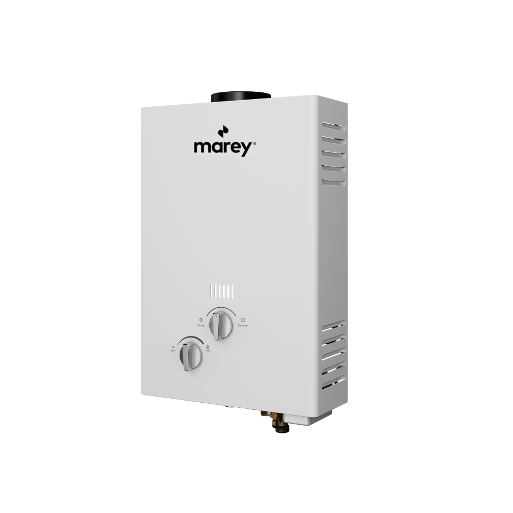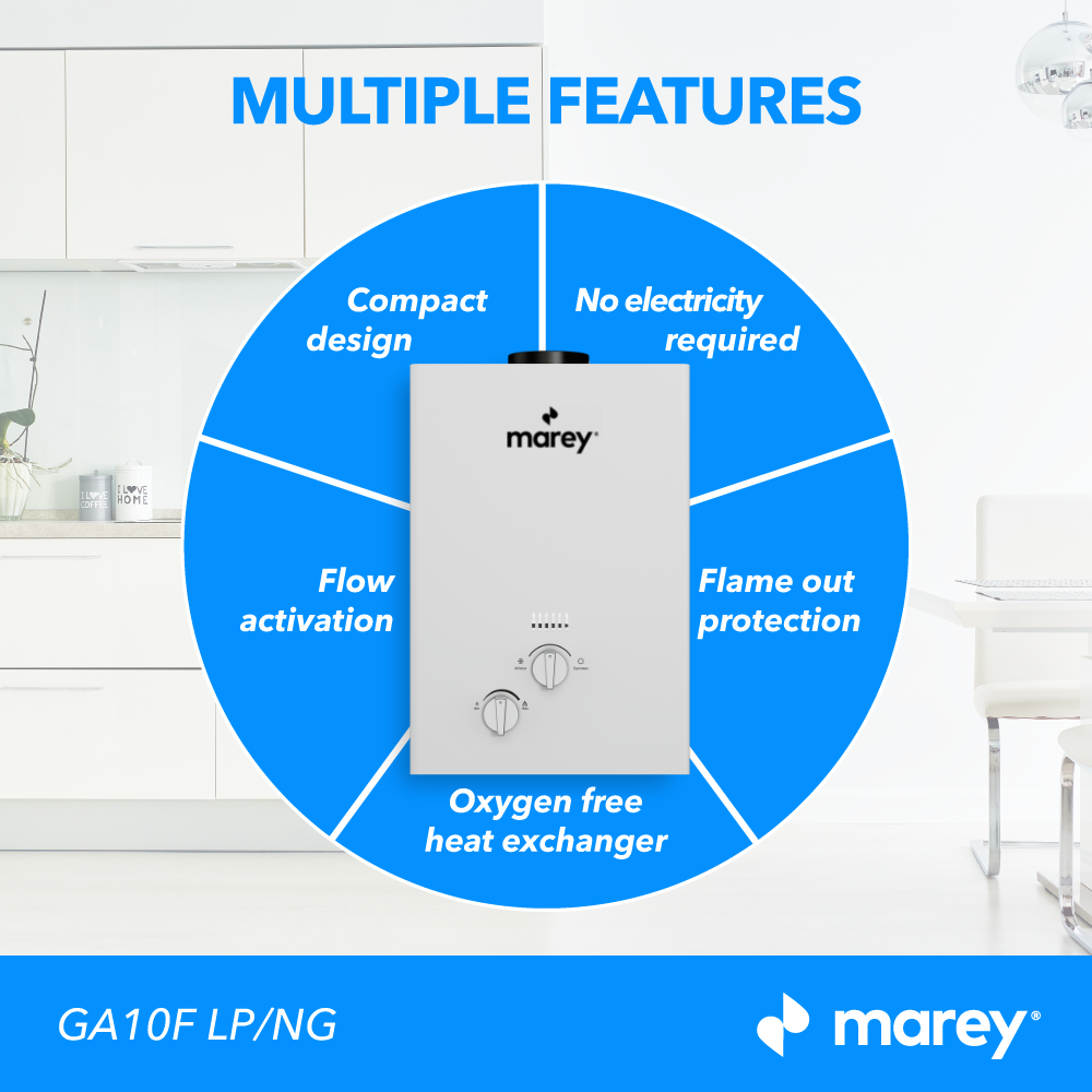 Compact design saves space and is easy to install almost anywhere, Provide endless hot water on demand and only as needed. Marey’s unit has a maximum input rating of 68,240 BTU/h and will provide a flow rate of up to 2.64 GPM output. No electrical connection is required; perfect for off-grid applications. Its small to medium water production is ideal for indoor usage, apartment, cabins, and tiny homes. You are able to control your temperature all year round with a convenient summer/ winter switch. Adjustable manual temperature control, multiple safety sensors including overhead and anti-dry heating. It is not recommended for elevations above 2,000 feet.