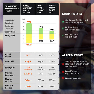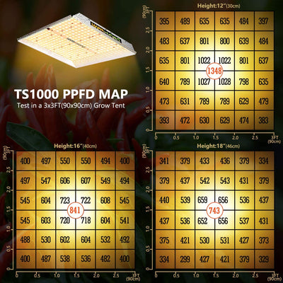 Mars Hydro TS-1000 white LED light, with the most advanced equipment and technology, provides tremendous light output to give you one of the brightest, the highest yield, full sun like spectrum lights. The TS-1000 is designed to be cost effective and energy efficient so you can maximize your harvest! The TS-1000 LED Grow Light can accommodate up to a 2' x 2' area for flower and 3' x 3' for vegetative growth.