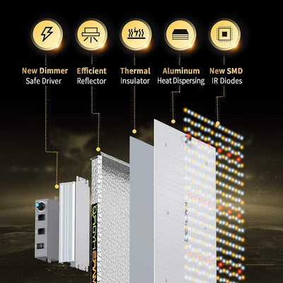 • Increase Yield & Crop Quality – The newest SMD LED technology provides the highest Par/Lumen output, giving you a 30% higher yield compared to old LED lights.  You can get up to 2.5g/watt yield.