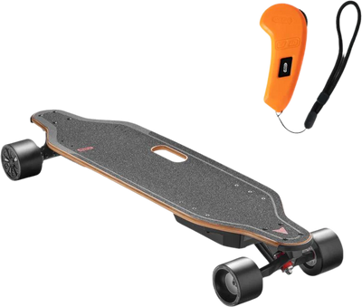 • Take it Anywhere: The cut-out part from the board allows easy portability. With a weight of 17.6 lbs., it is easy to carry. Just grab and go! The push-to-start feature allows you to turn on your electric skateboard by a simple push forward! Turn on your remote, push forward and off you go!
