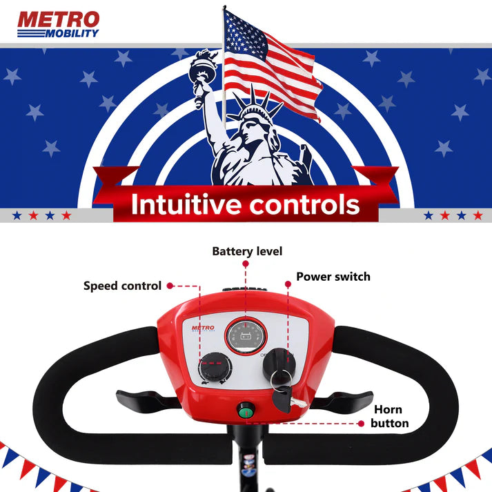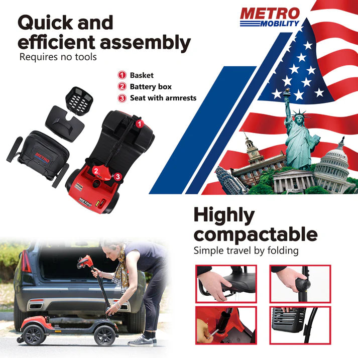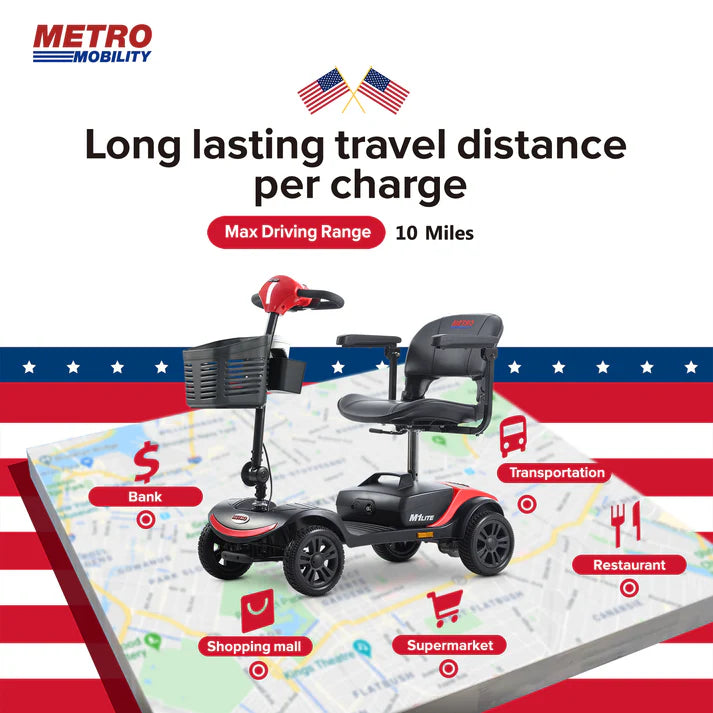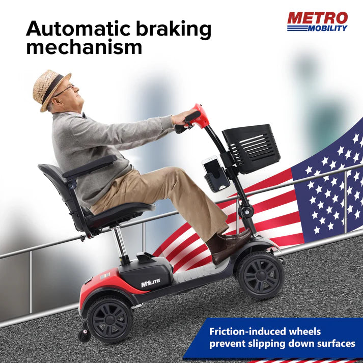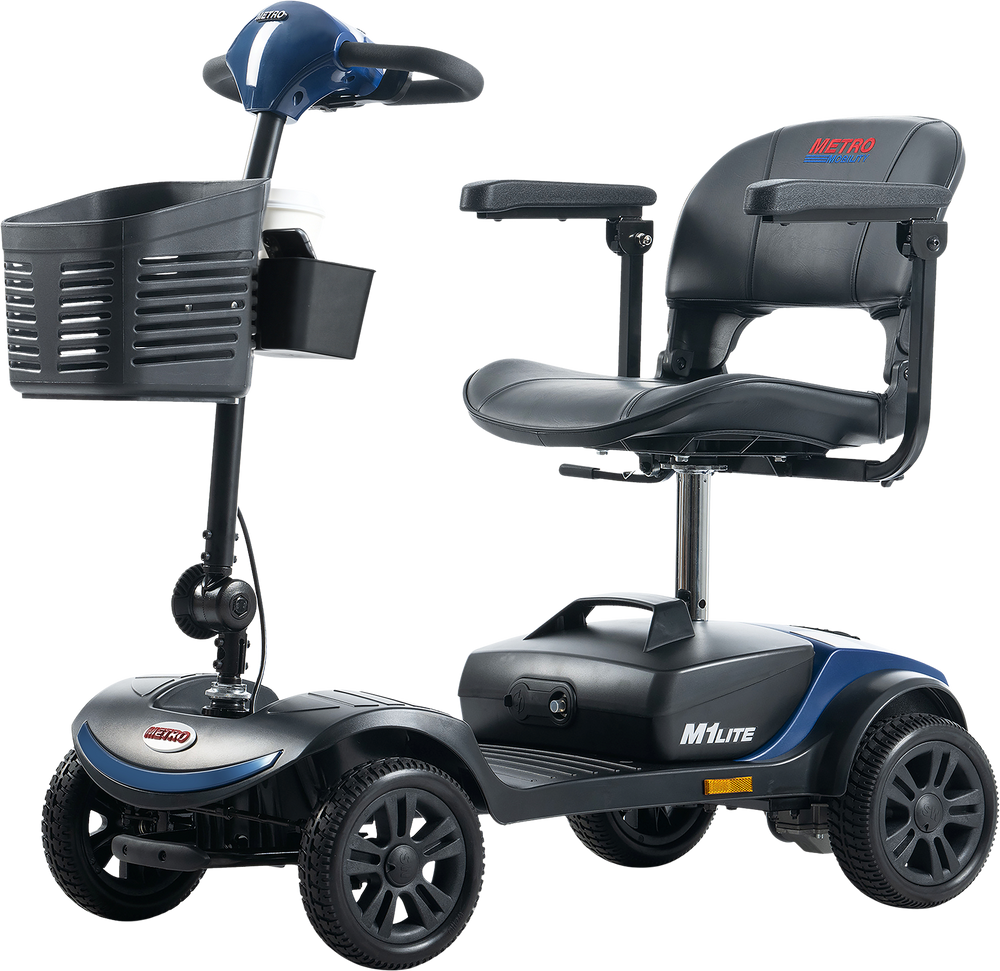 The M1 Lite is a 4-wheel mobility scooter that has a weight capacity of 265 lbs. Equipped with dual 12V 12Ah batteries and 300W motor you can travel to up to 10 miles on a single charge. The 9-inch large flat-free, non-marking front and rear tires with anti-tip wheels for added safety and support.