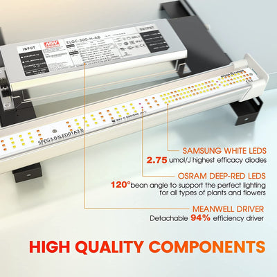 • PASSIVELY COOLED & DETACHABLE DRIVER: Bar light design and aluminum material on the back contribute to better airflow and great heat dissipation. SE3000 plant growing light comes with a detachable driver and long power cord, thereby reducing ambient heat in your growing space for an extended lifespan. With the waterproof circuit board, worry-free of the moist environment. Easy installation.