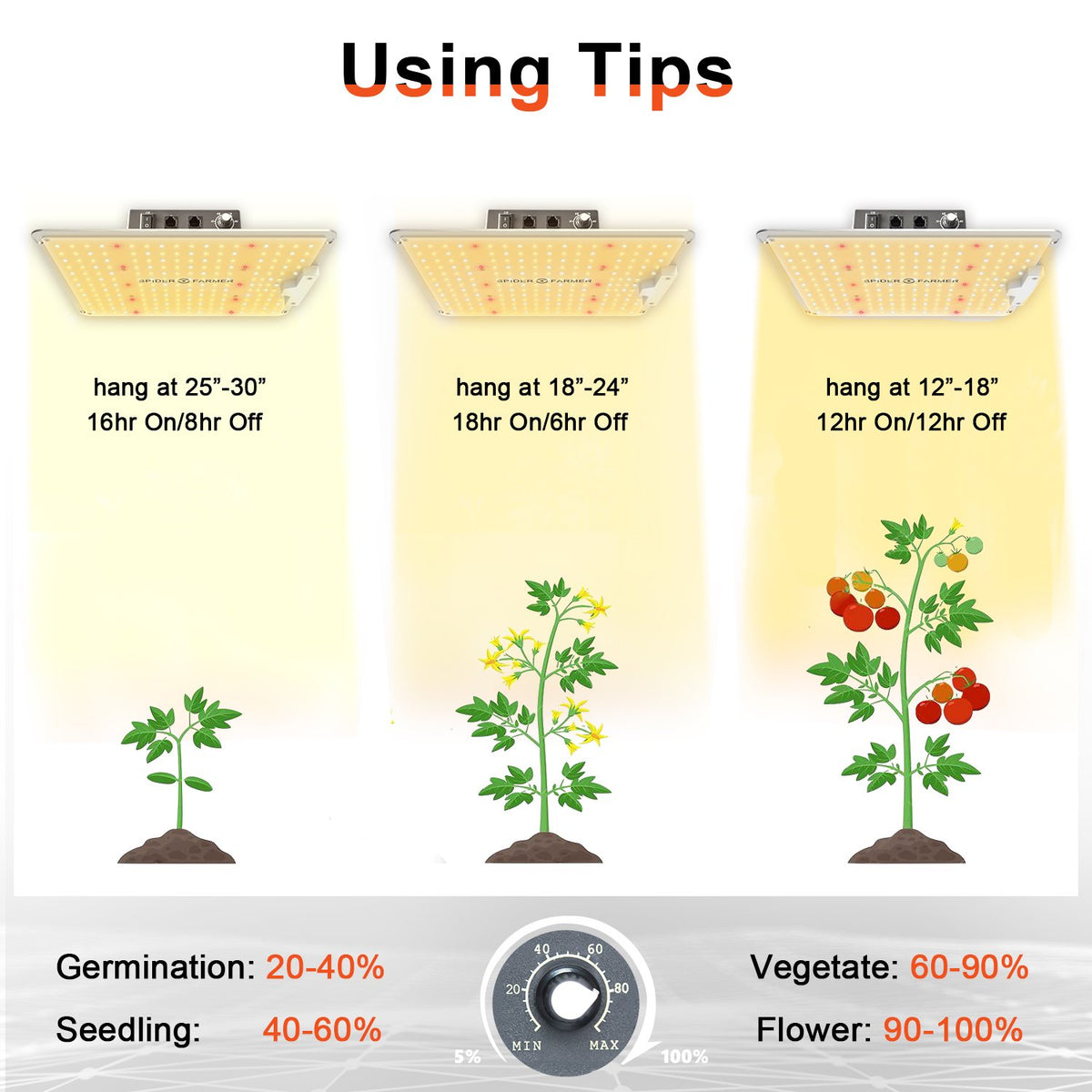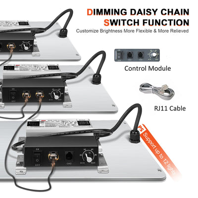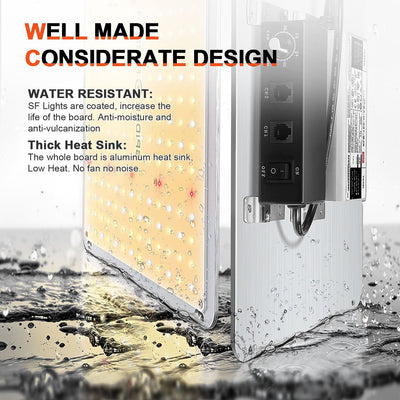 • CUSTOMIZED DIMMING DESIGN: Upgraded SF series growing lights have a dimming knob and light switch. A single light can be adjusted the light intensity at liberty. Multi-light Connection with unified dimming especially beneficial for large area of indoor growing and commercial planting.