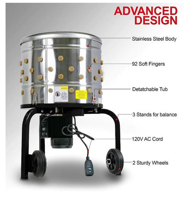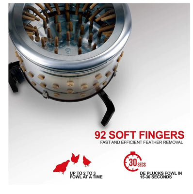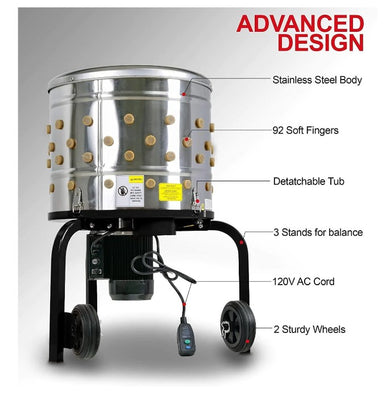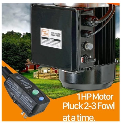 Our Heavy Duty Chicken Plucker & Poultry Processor utilizes a 1HP 120V AC 800W Electric Motor, 92 soft rubber fingers, and a large stainless steel drum to make removing your poultry feathers as easy as possible.