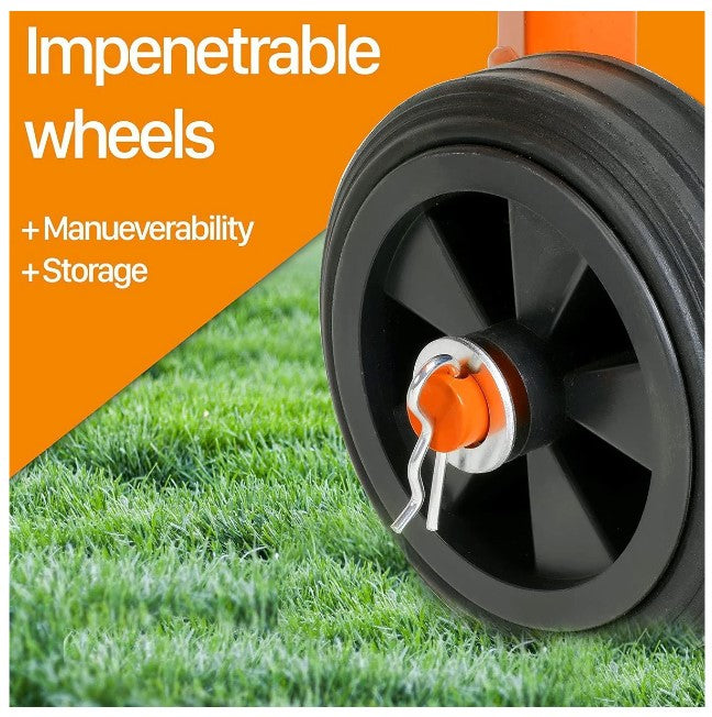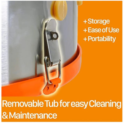 INDUSTRIAL DESIGN - A robust compact design for easy storage and transportation includes 2 wheels for optimal maneuverability. Built of premium safe and sanitary 403 Brushed Stainless Steel.