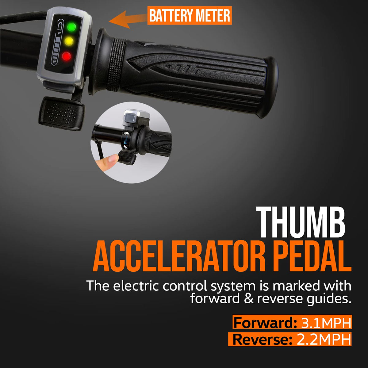 • PERFORMANCE - Speeds (Variable); Forward 0-5km/h (3.1MPH); Reverse 0-3.5km/h (2.2MPH); 2-5 hours of use per full battery charge (varies on load/slope); ECO-FRIENDLY (Green and Safe) Unlike gasoline devices, battery-powered produce no smog and are quieter