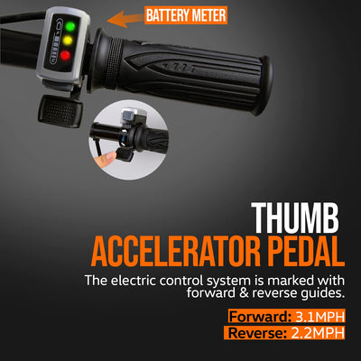 • POWER SOURCE - All Electric 24V Brushless motor system, we used (2) 12V 7Ah Rechargeable Deep Cycle Non-Spillable Sealed Lead Acid Batteries, totaling to 24V MAX Series Connection System providing 168Wh (watt hours) of use