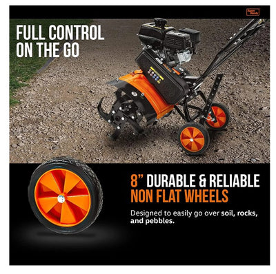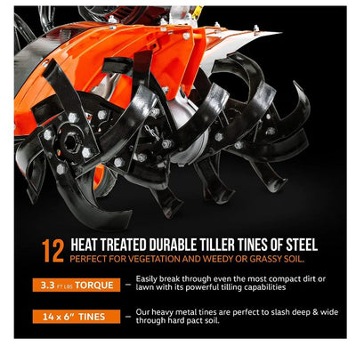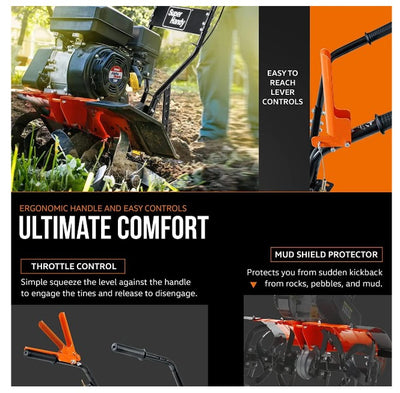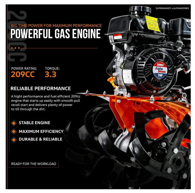 • POWER THAT MAKES THE DIFFERENCE - This Tiller is equipped with a powerful 7Hp 209cc single-cylinder OHV engine, which provides a great power-to-weight ratio. It has a recoil starter and a centrifugal friction clutch. The maximum rotating power is 3600 RPM and the maximum tine speed is 100 RPM, with a 30:1 reduction ratio.