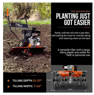 • The working width ranges from 21-27 inches and the tilling depth is 7-14 inches, allowing for fast and efficient work in the field or on your personal land.