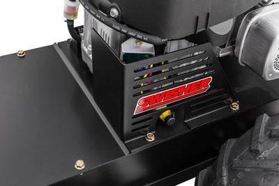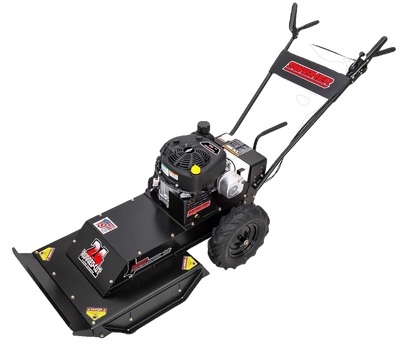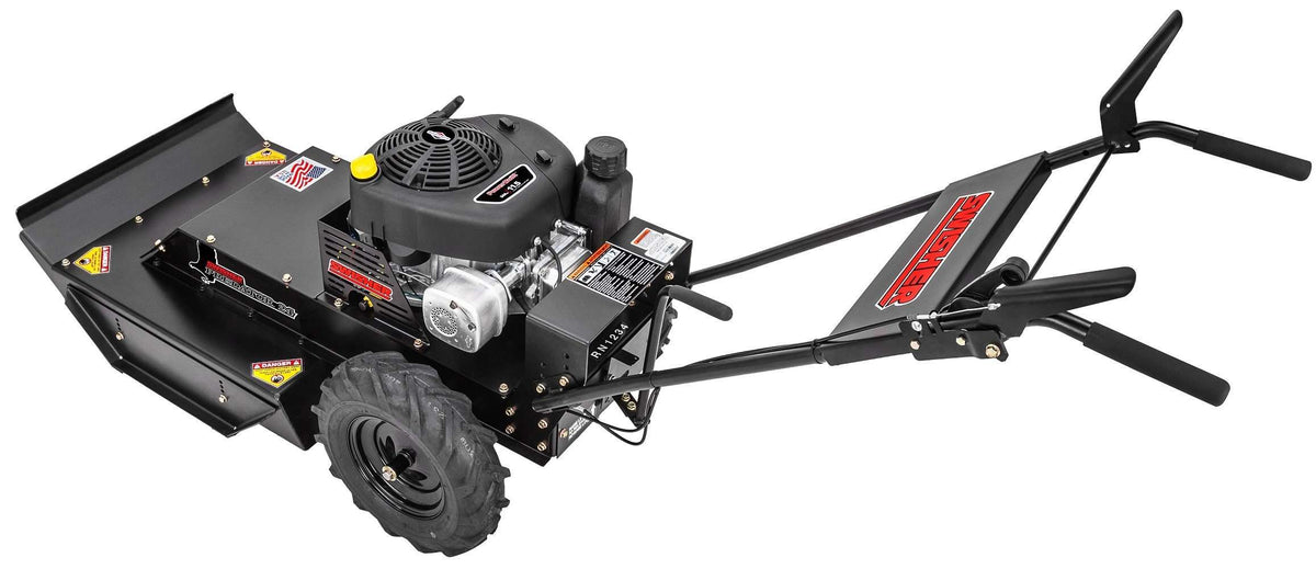 Swisher's 24" walk-behind rough-cut mower is perfect for cutting trails through the woods and clearing fields and ditches year-round. It will clear the densest undergrowth and saplings up to 1-1/2 inches in diameter. This self-propelled walk-behind features an 11.5 HP Briggs & Stratton engine and a heavy-duty fabricated cutting deck with a 1 3/4" cutting height range. The single, fixed hardened-steel blade zips through brush and saplings with ease, and the blade is enclosed for maximum safety. Handlebar mounted controls are easily accessible for PTO, self-propelled and safety. The adjustable height handlebar eases operator control. Large pneumatic chevron tires roll easily over the roughest terrain for excellent traction in all conditions. The four-speed transmission is great for setting a comfortable pace, and a reverse mode is handy for backing out of rough spots. Front and side safety deflectors protect against flying debris while the wire shield protects electrical components.