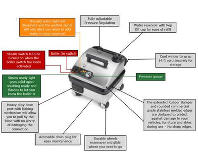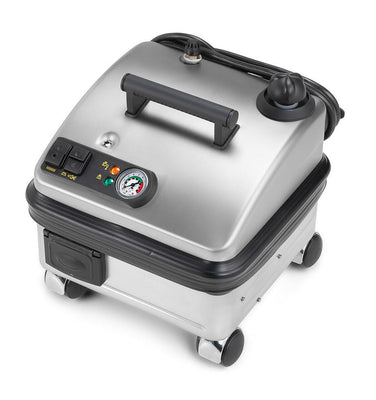 The Vapor Clean Pro6 Duo is a commercial steamer with a quick 9 minute preheat time with continuous fill boiler system and stainless steel housing. The 311 degree F continuous fill boiler offers continuous operation with no cool down time in between refills, and the audible alarm alerts you when the 2.1 quart water reservoir is low.
