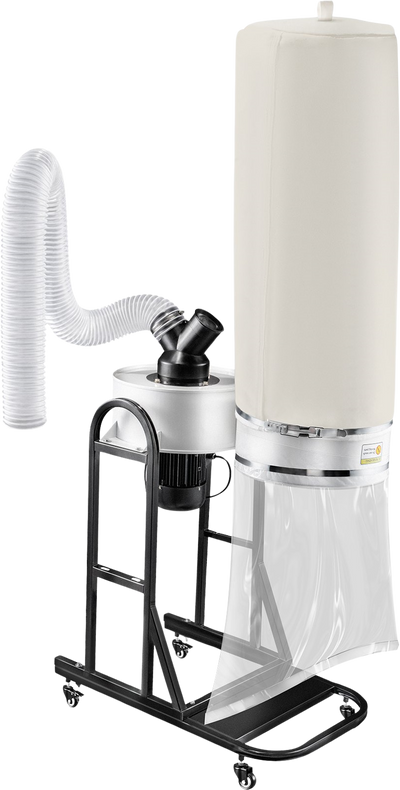Vevor's cyclone dust collector uses strong suction power to absorb dust in the air produced by woodworking, metal processing, and more. Through the direct-mount fine filter, this dust collector can capture the smallest particles down to 25-micron. The 13.2 gallon collection bag meets large capacity demands, and quick-release levers make emptying easy. With 4 swivel casters for easy mobility and a powder-coated finish resistant to wear and corrosion, this dust collector is ideal for various industrial applications, including manufacturing, woodworking, and metallurgy.