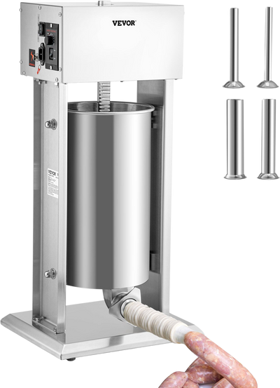 The Vevor electric sausage stuffer, with a large 4 Gal (15 L) capacity, allows for efficient, large-batch sausage making. It features a robust 260-watt motor for commercial-grade performance and a double air release valve to ensure optimal taste. The stuffer offers stepless speed regulation and a foot pedal switch for hands-free operation. It includes four stainless steel filling tubes (Φ0.6 in., Φ0.83 in., Φ1.2 in., Φ1.5 in.) to accommodate various sausage sizes and minimize meat waste. Constructed from food-grade stainless steel, this electric sausage stuffer ensures long-lasting durability, meets hygiene standards, and facilitates easy cleaning with its detachable design.