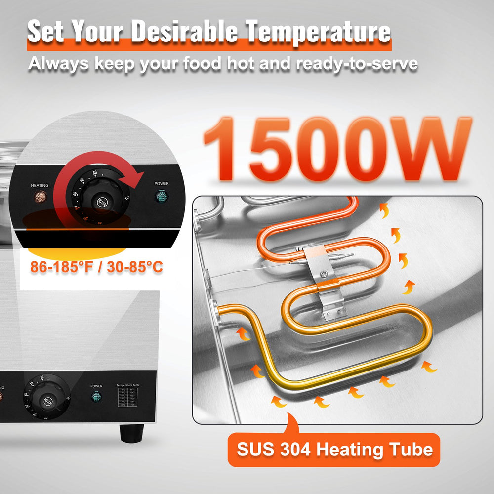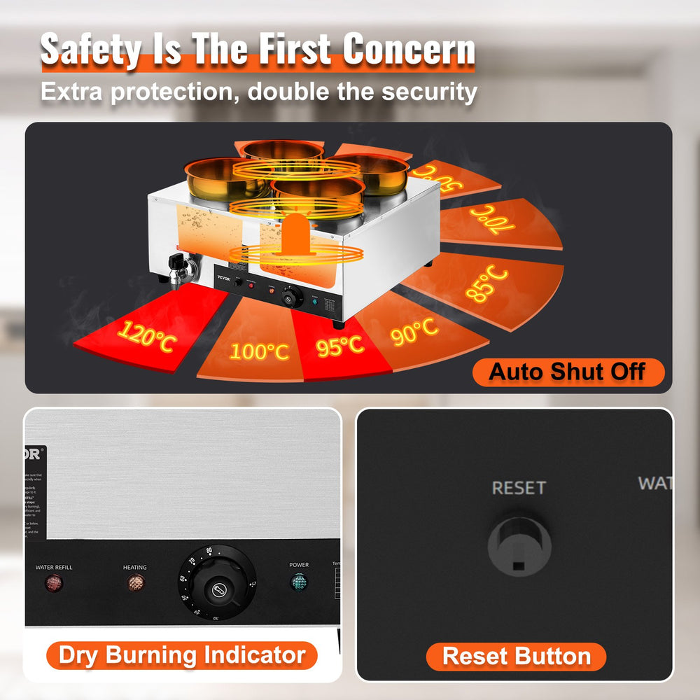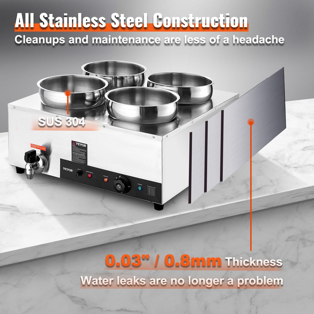 Serve up a variety of dishes with ease using the Vevor Electric Soup Warmer, complete with four 7.4 Qt. round pots and lids for simultaneous service. Its 1500W heating tube swiftly warms food while allowing temperature adjustments from 86 to 185°F for optimal taste. Safety features include a "Dry Burning Indicator" and a convenient "Reset Button" for peace of mind during operation. Crafted with durable SUS 304 stainless steel, this soup warmer ensures easy maintenance and longevity, with thoughtful details like water level markers, a draining faucet, and two long-handled ladles for added convenience.