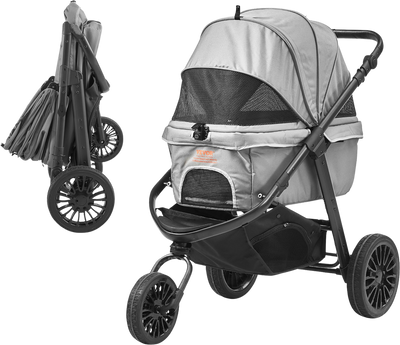 The Vevor Pet Stroller offers a sturdy and durable design with a 75 lbs. weight capacity, featuring a rust-resistant aluminum alloy frame. Its large, wear-resistant wheels provide a smooth ride on any terrain, with 360° swivel front wheels for easy maneuvering and a dual-brake system for safety. The 800D Oxford fabric and mesh windows ensure durability, breathability, and comfort for your pet, while the adjustable handle height and leather cover provide ergonomic convenience. With easy folding and a compact design, this stroller is perfect for travel and storage.
