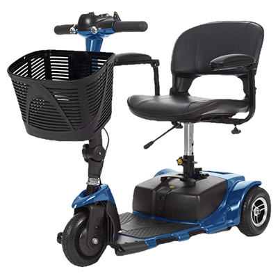 The Vive Health MOB1025 is a 3-wheeled mobility scooter that is easy to assemble/disassemble for travel. The variable speed settings allow for safe indoor and outdoor usage. The scooter features a height adjustable padded seat and sturdy storage basket. You can travel up to 12.4 miles with the long-range battery that features an off-board charger.