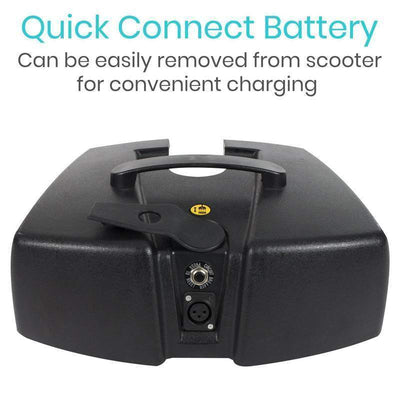 Providing safe, stable mobility assistance, the Vive four-wheel mobility scooter easy maneuvers over smooth, indoor and outdoor surfaces such as concrete, pavement, tile and carpeting with a turning radius of 51.5". The mobility scooter includes a lightly padded seat and backrest with flip-back armrests, 8” flat-free tires and a front-mounted storage basket for carrying daily necessities. With a top speed of 3.7 mph, the mobility scooter has a driving range of up to 12.4 miles per charge. The power scooter also quickly disassembles into four pieces to easily fit in an average size vehicle.