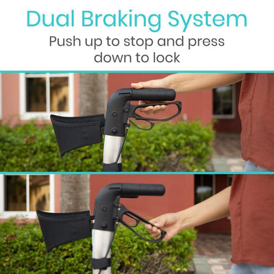 Dual Braking System: Each of the ergonomic handles is angled to position hands in a neutral position, reducing fatigue and allowing easy access to the bicycle-style hand brakes. Wheel-locking brakes ensure the rollator will not move when activated.