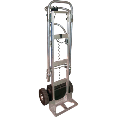 Aluminum hand truck offers 600 lb. hand truck capacity and 1,200 lb. platform truck capacity (600 lb capacity in 2-wheel mode and 950 lb. capacity in 4-wheel mode when operated on a standard 17.5° loading ramp).