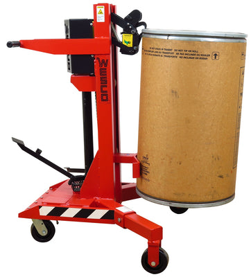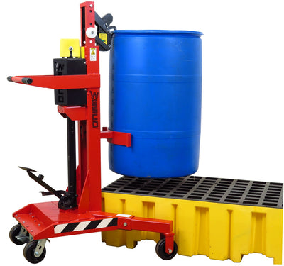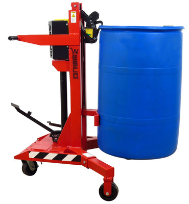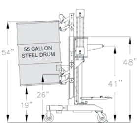 Drum handler easily lifts and transports steel, poly or fiber drums up to 1,100 lbs. Handles most 30, 55 and 85 gallon drums. Spring-loaded clamp holds any 3/16" or higher drum rim. Foot operated hydraulic pump raises drum 20" off the floor.