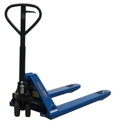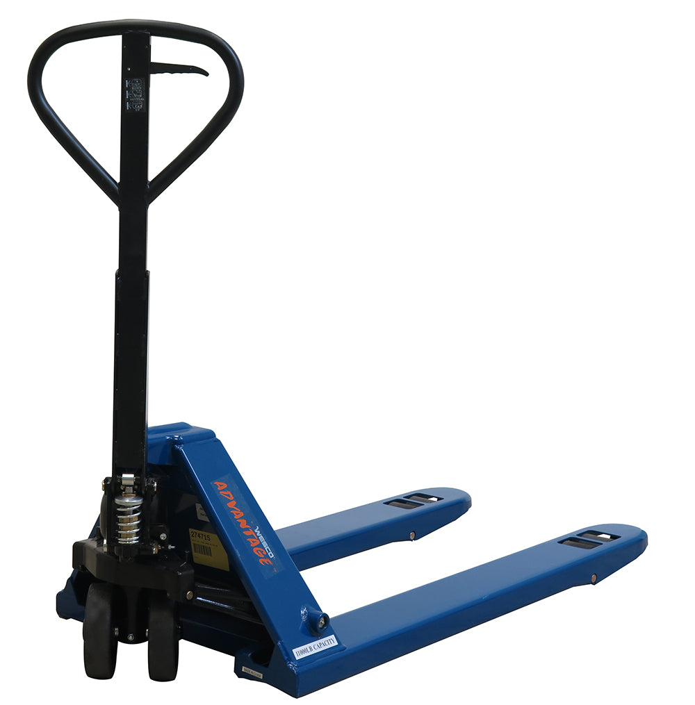 Quickly and easily transport palletized loads with this Wesco Industrial Products 274715 Advantage Pro-Max pallet truck with 27" x 48" forks. With a durable, high-strength steel frame and a 11000 lb. capacity, this pallet truck is ideal for warehouses, storage rooms, or anywhere with items stored on pallets.