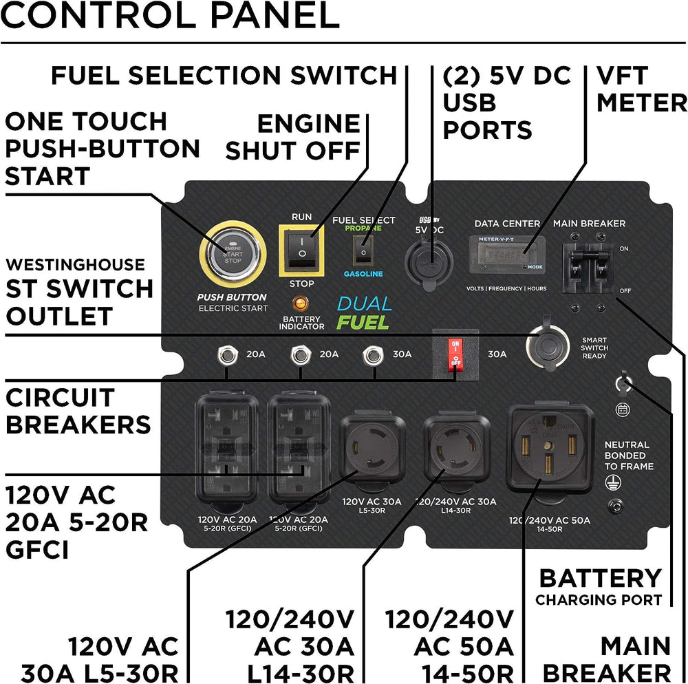 - (2) GFCI 5-20R household duplex outlets, (1) L5-30R, (1) Transfer Switch Ready L14-30R 120/240-Volt twist-lock, (1) 120/240V 14-50R, and (2) USB ports with rubber outlet covers