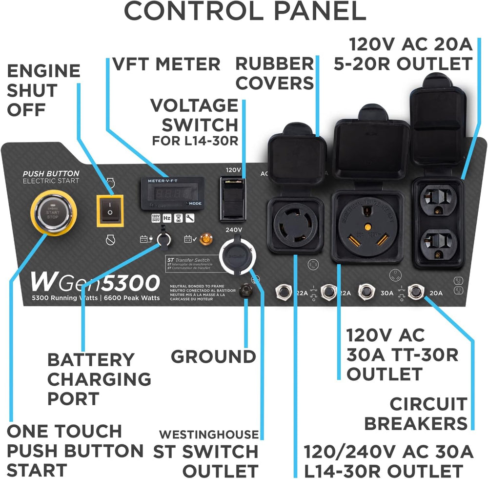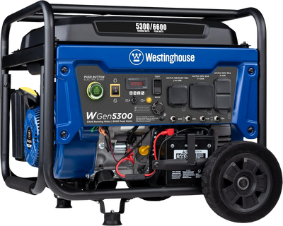 The Westinghouse WGen5300 is a versatile solution for all your power needs from your home to your travel trailer when you’re looking for a dependable backup power supply. The WGen5300 produces 6,600 peak watts and 5,300 running watts with a powerful 274cc 4-Stroke OHV Westinghouse Engine constructed for durability. Running for up to 14.5 hours on a 4.7 gal. (18L) tank of gas, it's conveniently equipped with a built-in fuel gauge, automatic low oil shutdown, and Push-Button Electric Start with a remote start key fob.