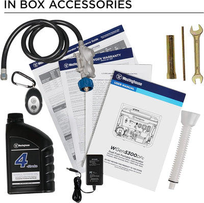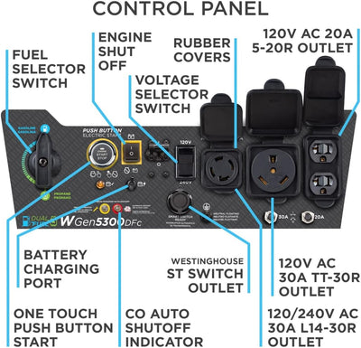 The Westinghouse WGen5300DFc is a versatile solution for all your power needs from your home to your RV when you’re looking for a dependable backup power supply. With dual fuel ability, this generator offers versatility by running on either gas or propane (LPG). The WGen5300DFc produces 6,600 peak watts and 5,300 running watts with a powerful 274cc 4-Stroke OHV Westinghouse Engine constructed for durability. Running for up to 14.5 hours on a 4.7 gal. (18L) tank of gas, it's conveniently equipped with a built-in fuel gauge, and Push-Button Electric Start with a remote start key fob.