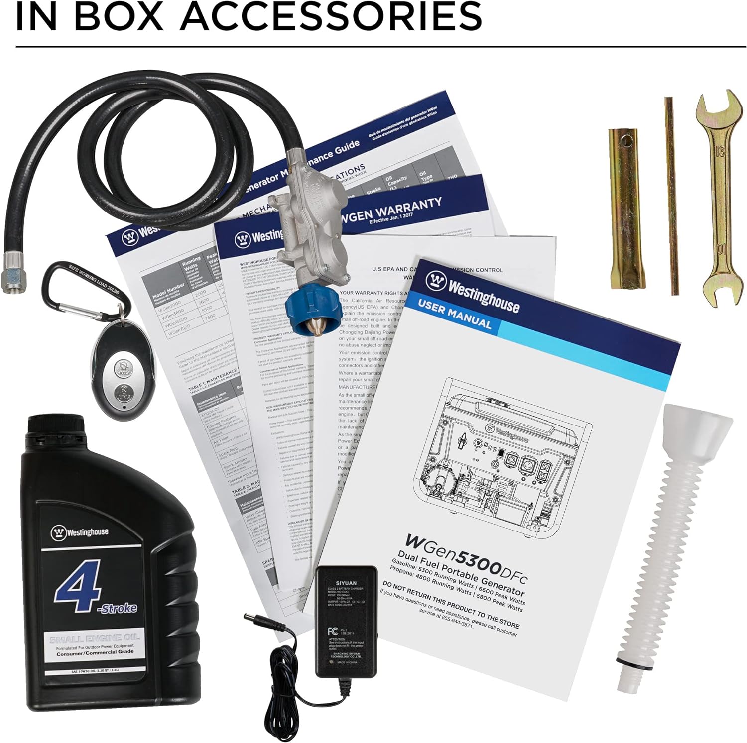 Included Accessories Oil Bottle, Oil Funnel, Spark Plug Wrench, Remote, Propane Regulator/Hose, Battery Float Charger