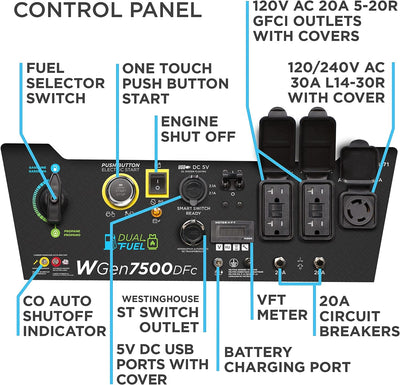 Westinghouse WGen7500DFc Generator 7500W/9500W 30 Amp Remote Start Dual Fuel with CO Sensor New