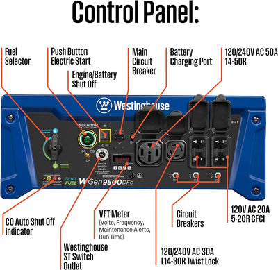 Westinghouse WGen9500DFc Generator 9500W/12500W 50 Amp Remote Start Dual Fuel with CO Sensor New