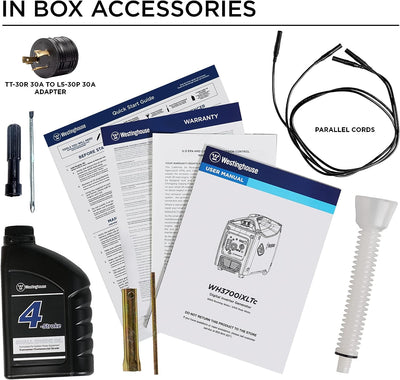 | Included Accessories | Oil Bottle, Oil Funnel, Spark Plug Wrench, Dual-Head Screwdriver, Parallel Cords, L5-30 to TT-30 Adapter |